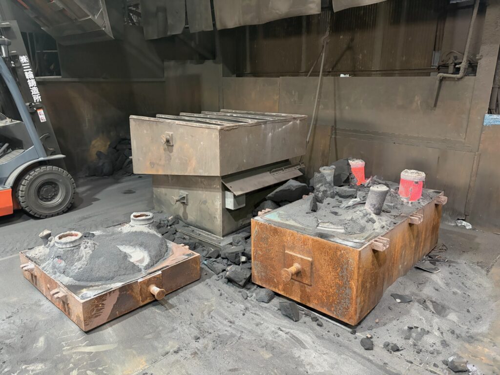 鋳型に流した溶湯が冷えて固まった後に、鋳物を取り出していきます。