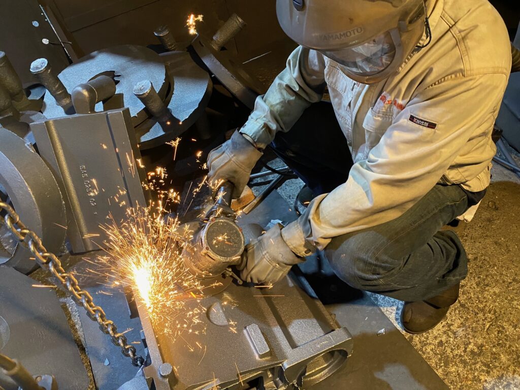 鋳型を壊して取り出された鋳物には、バリや鋳型の砂などが付着しています。