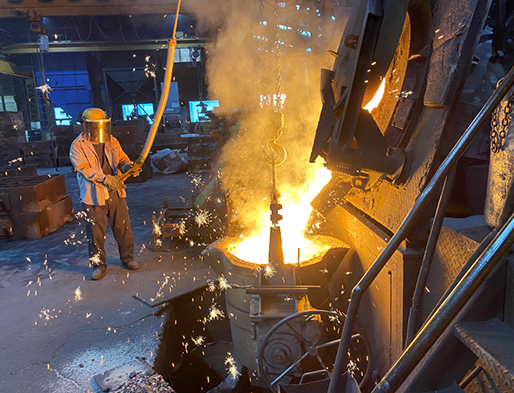 金属は主に、銑鉄とスクラップ材や以前の鋳造で利用して戻ってきたリターン材を使い、合金や炭素を入れて成分調整していきます。